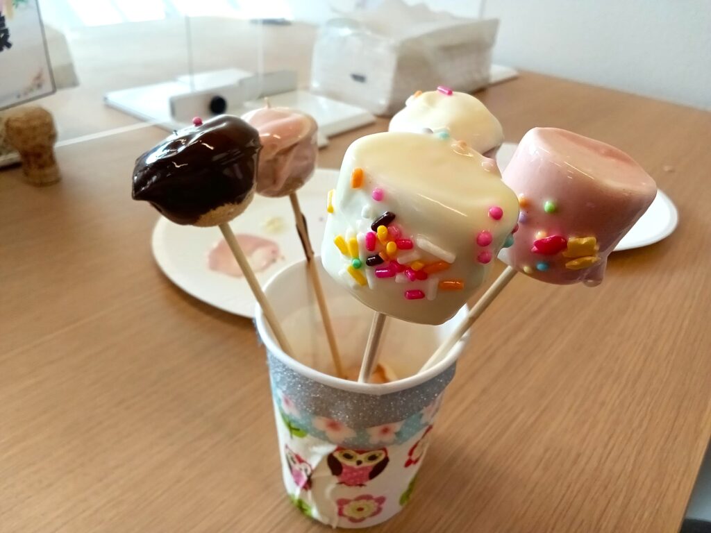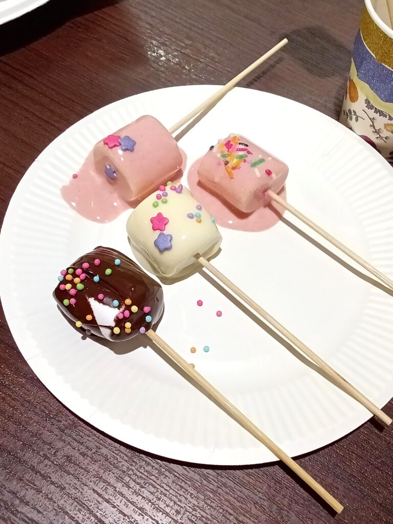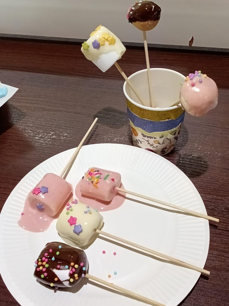 マシュマロや鈴カステラに溶かしたチョコレートをコーティングし、カラースプレーなどで様々なデコレーションをしたり、カップもマスキングテープを使用したオリジナル作品です。皆さん会話も弾みながら楽しいひとときとなりました。スミレの花ではこれからも季節を感じていただけるイベントを開催していきます。